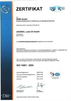 В октябре 2010 года система экологического менеджмента Addinol получил от ведущего в Германии и признанного во всем мире немецкого органа по сертификации систем управления DQS сертификат DIN EN ISO 14001. Этим официально было задокументировано, что компания эффективно внедрила и претворила в жизнь систему экологического менеджмента согласно стандарту DIN EN ISO 14001.